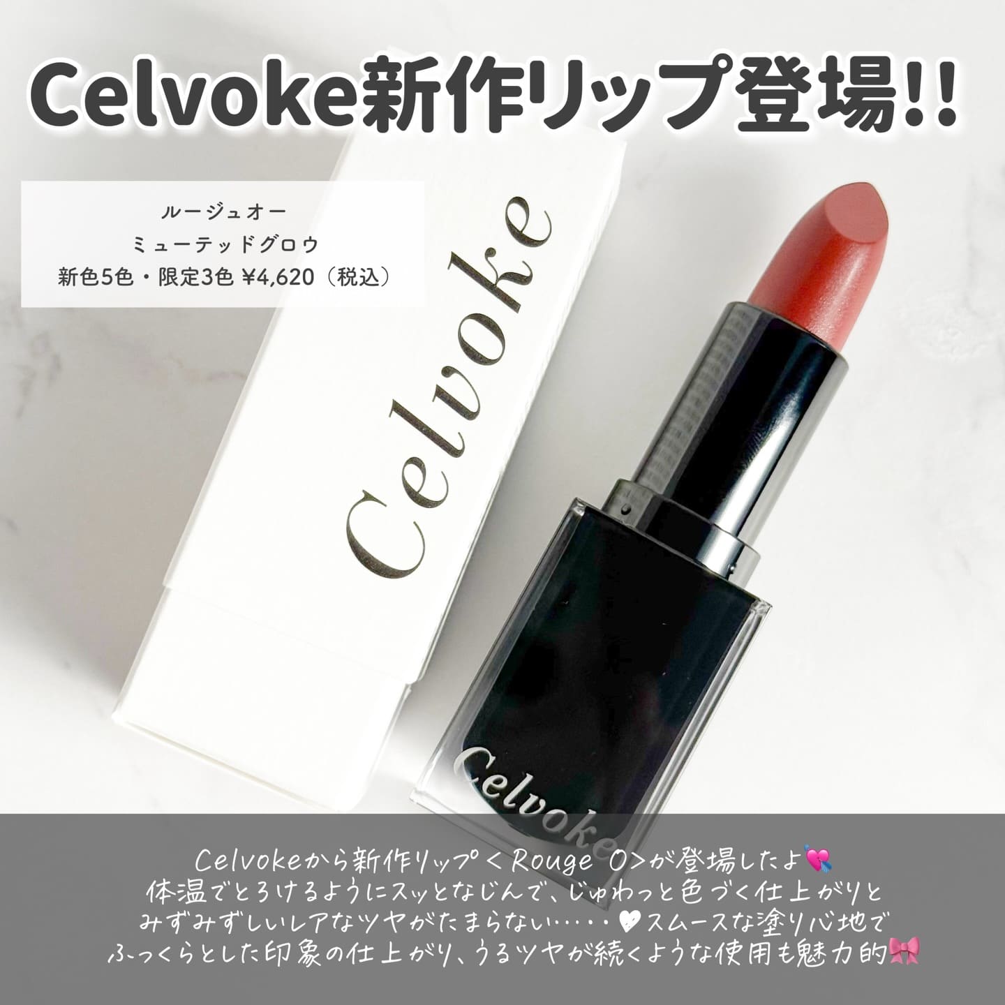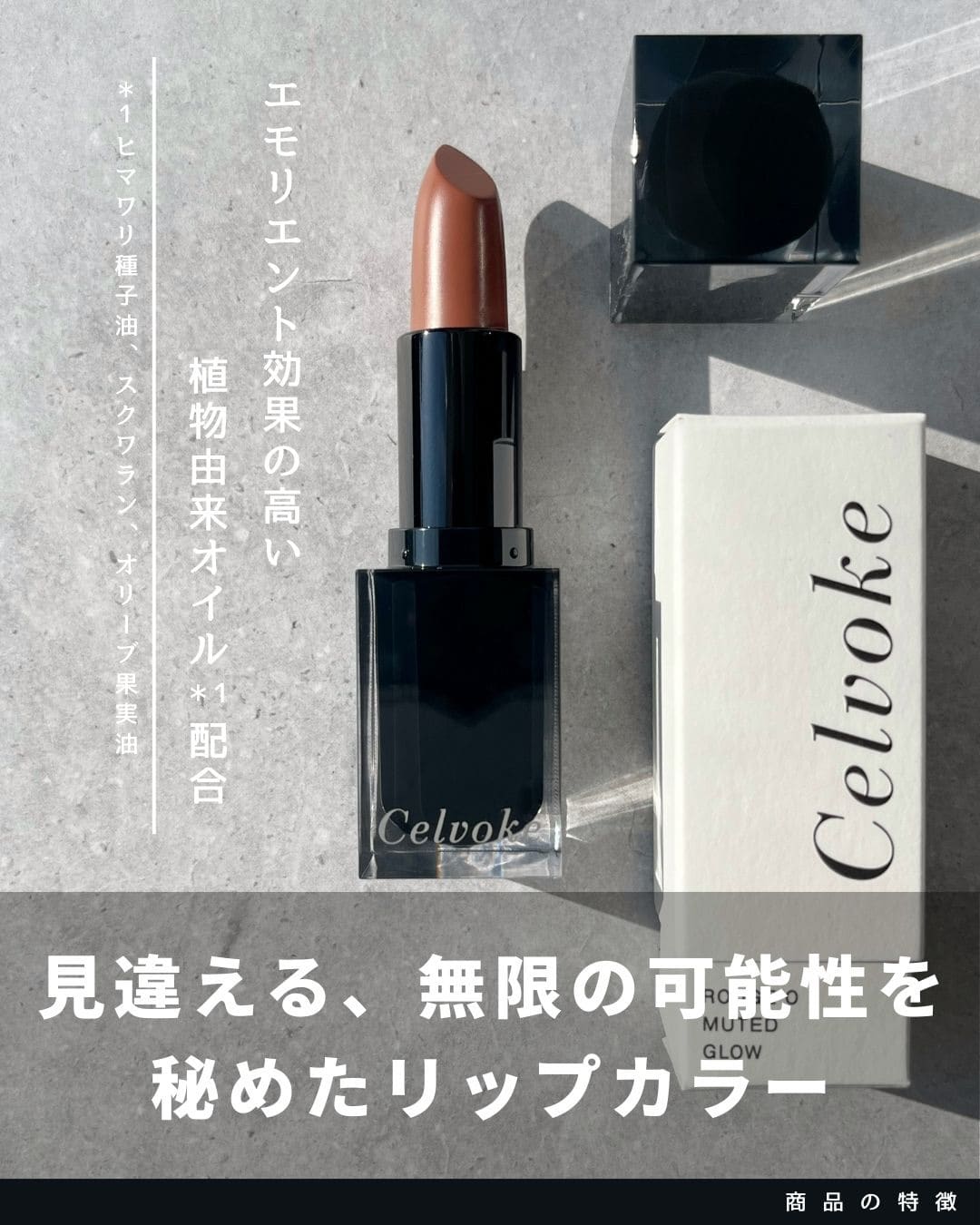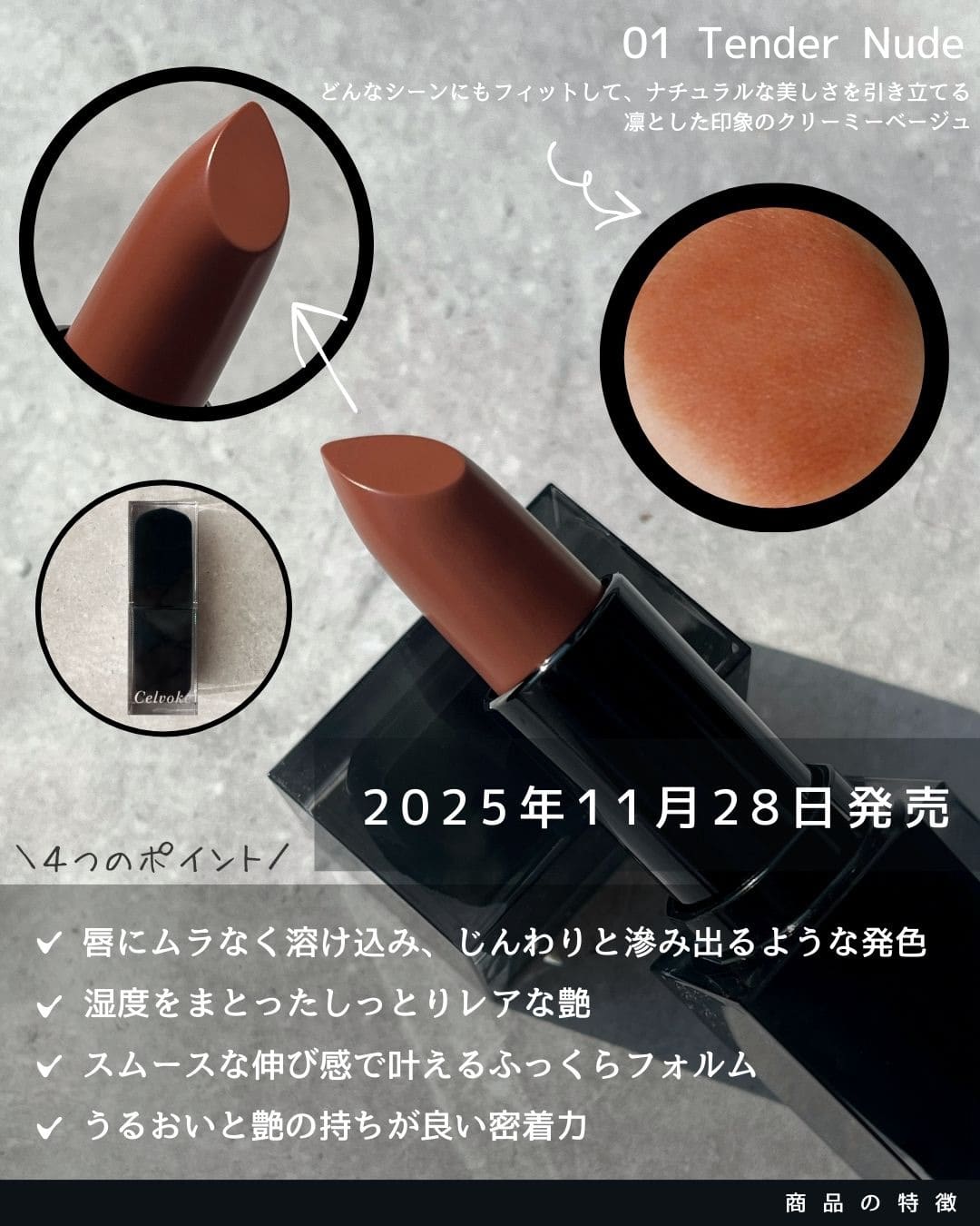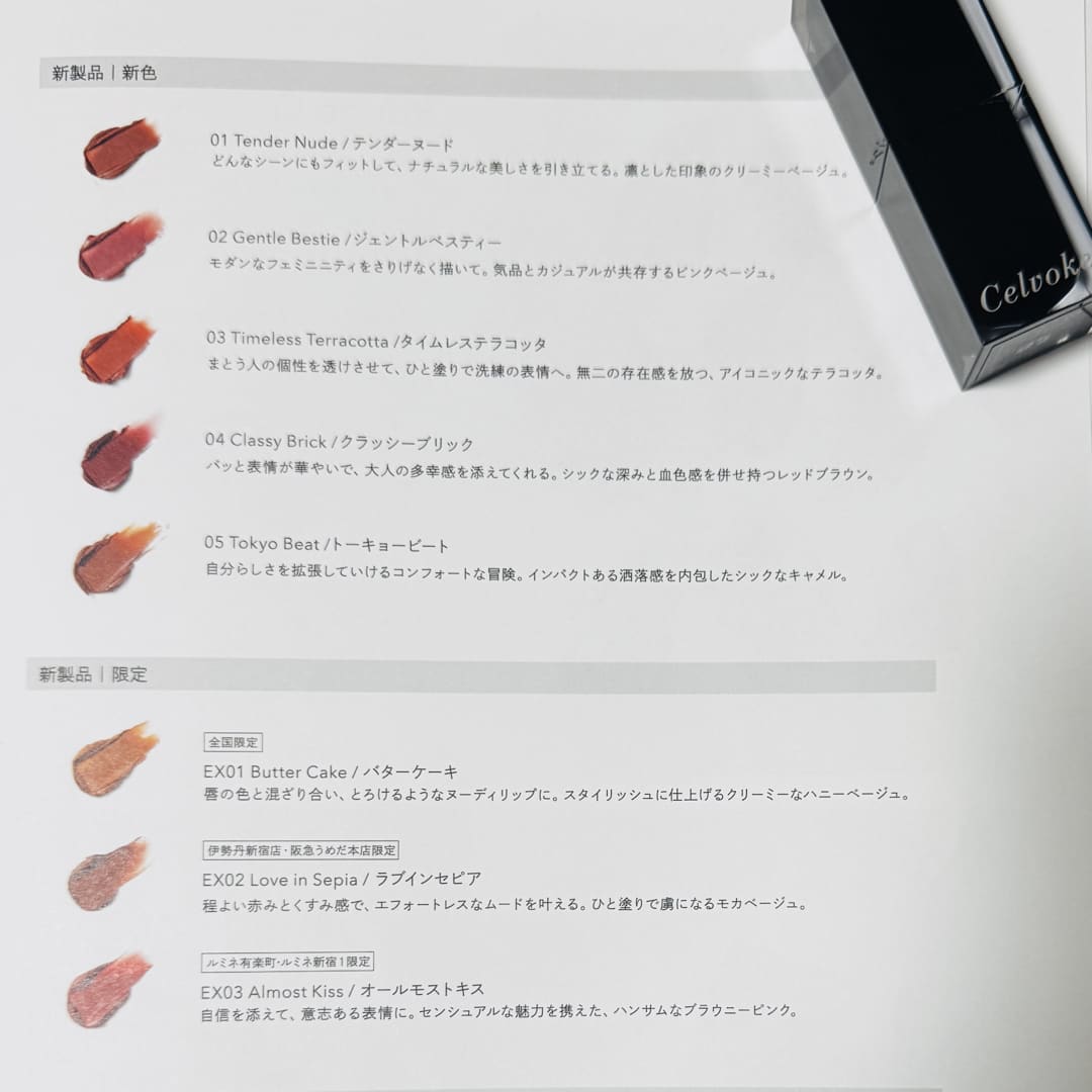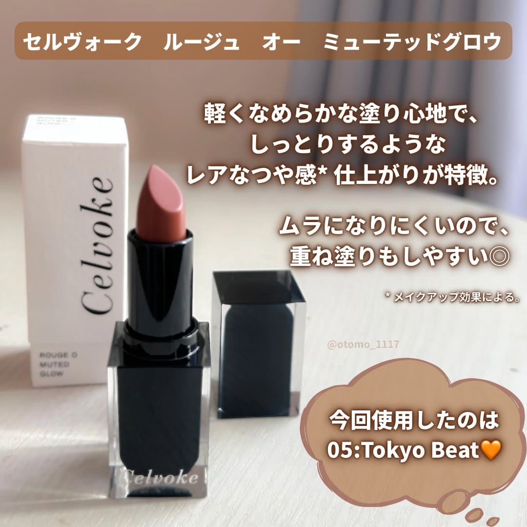 1. Rouge O Muted Glow ミューテッドグロウな質感 2. Arouse Lips シースルー発色のティントリップバーム 3. Liberated Matte Lips N エモーションを描く、奥ゆきのボールド発色 4. Dignified Lips 唇の潤いが弾けるニュアンス発色 5. Moisten Lip Drop みずみずしく唇を彩るセラムグロス ARTIST'S RECOMMEND LIP VARIATION 艶やかに色づく、洗練モードな口元へ。 Celvokeのリップは絶妙なカラー展開と 豊富なテクスチャーに進化。 今こそ、なりたい自分になれるリップを探して。 ARTIST'S RECOMMEND 人を選ばない王道ピンク 品のあるブラウンリップ ヘルシーなヌードカラー AKIRA NAKANISHI EXECUTIVE MAKEUP ARTIST プロフィールを見る Seasonal Item ROUGE O MUTED GLOW 10 アウトサイドプレッピー あでやかに色づきチャーミングな表情を引き立てる。唇にメロウな可愛げがあふれるコーラルピンク 人を選ばない王道ピンク 正統な雰囲気のピンクカラーはリップカラーに迷った時に、これ使えば大丈夫と思える日々のお助けアイテム。 + Just One More インディケイトアイブロウパウダー 10 モーヴプラム インフィニトリーカラー 09 マーシュローズ 顔のパーツで一番上のアイブロウと一番下のリップ。アイブロウパウダーとリップカラーを同系色にする事でメイクに統一感を出す事が出来ます。カラーアイブロウが苦手な方はチークカラーやアイシャドウにピンクカラーを使い統一感を出すのがオススメの使い方です。 YAMAKAWA KAZUYOSHI MAKEUP ARTIST プロフィールを見る Seasonal Item ROUGE O MUTED GLOW 06 サイレンスネスト 唇と表情にソフィスティケイトされたムードをオン。ほのかに黄味をまとったニュアンスフルなブラウン デイリーに使えて品のあるブラウンリップ ブラウンに血色感がプラスされて春のモードカラーとしておすすめです。赤味を帯びているので、顔色を下げずにおしゃれな印象の1本です。 + Just One More インフィニトリーカラー N 05 ブリックレッド ヴァティックアイズ 31 マーズバレー ドローイングリップペンシル 01 バーントトープ リップと相性がいい、赤みニュアンスのブラウンのインフィニトリーカラーを指でアイホールや下まぶたに馴染ませます。ヴァティックアイズ31を重ねて煌めきをプラス。口元はリップライナーでアウトラインを整え存在感のある印象に。 お好みでインフィニトリーカラーをチークとしてプラスしても。シンプルなアイテムでムードのある女顔に仕上がります。 SASAMORI MINA MAKEUP ARTIST プロフィールを見る Seasonal Item ROUGE O MUTED GLOW 07 モーニングデューン 唇の色を透かしつつ色づき自分らしいヌードリップに。ヘルシーな洒落感が宿るエフォートレスベージュ ヘルシーで温かみあるヌードカラー 唇の色をラフにカバーしふんわりとした血色がにじみ出るヌードベージュはメイクのバランスを中和してくれるカラー。 + Just One More ヴァティック アイズS 04 ホットビスター ヴァティック アイズS 01 メイズ インフィニトリーカラー N 04 ポメグラネイト ヌードリップには深みのあるアイメイクがオススメ。赤みのあるブラウンをぐるっと上下にのせてイエローカラーでアクセント。質感もしっとりマットで統一感を。チークは目の下から繋がるように2,3回重ねてこっくりした血色を出し高揚感のある雰囲気に。 Celvoke LIP VARIATION 1. Rouge O Muted Glow ミューテッドグロウな質感 2. Arouse Lips シースルー発色のティントリップバーム 3. Liberated Matte Lips N エモーションを描く、奥ゆきのボールド発色 4. Dignified Lips 唇の潤いが弾けるニュアンス発色 5. Moisten Lip Drop みずみずしく唇を彩るセラムグロス Rouge OMuted Glow 01 テンダーヌード 02 ジェントルベスティー 03 タイムレステラコッタ 04 クラッシーブリック 05 トーキョービート BEST SELLER 06 サイレントネスト 07 モーニングデューン 08 カシミアピンク 09 ネオミューズ 10 アウトサイドプレッピー EX01 バターケーキ EX04 ジンジャーサンド ミューテッドグロウな質感 ルージュ オー ミューテッドグロウ4,620円(税込) 限定 限定 詳細を見る User's Voice otomo_1117 紹介カラー :05 トーキョービート . \Celvoke新作リップ🧡/ 2025.11.28に全国発売されたセルヴォーク ルージュ オー ミューテッドグロウ✨ しっとりするようなツヤ感* と、なめらかで軽い塗り心地がお気に入り♡ムラになりにくいから、重ね塗りして色の存在感を高めてみたりするのも楽しい◎ * メイクアップ効果による。 ─────────── 今回使用したのは【05:トーキョービート】🧡インパクトある洒落感を内包したシックなキャメル。 手元で試した時は黄み強過ぎるかな?と思ったけど、意外と使ってみると自分的にはなじんでる気がするしお洒落なカラーで気に入ってる🫶🏻 季節問わず使いやすい質感だと思うから他のカラーも集めたい😍 View More chi_ku_wa_07 紹介カラー :01 テンダーヌード セルヴォーク ルージュ オー ミューテッドグロウ オイルとワックスを組み合わせた処方が叶えるシームレスな薄膜が、唇をフォルミングしながら滲むように発色。 体温と溶け合うことで湿度を感じるミ